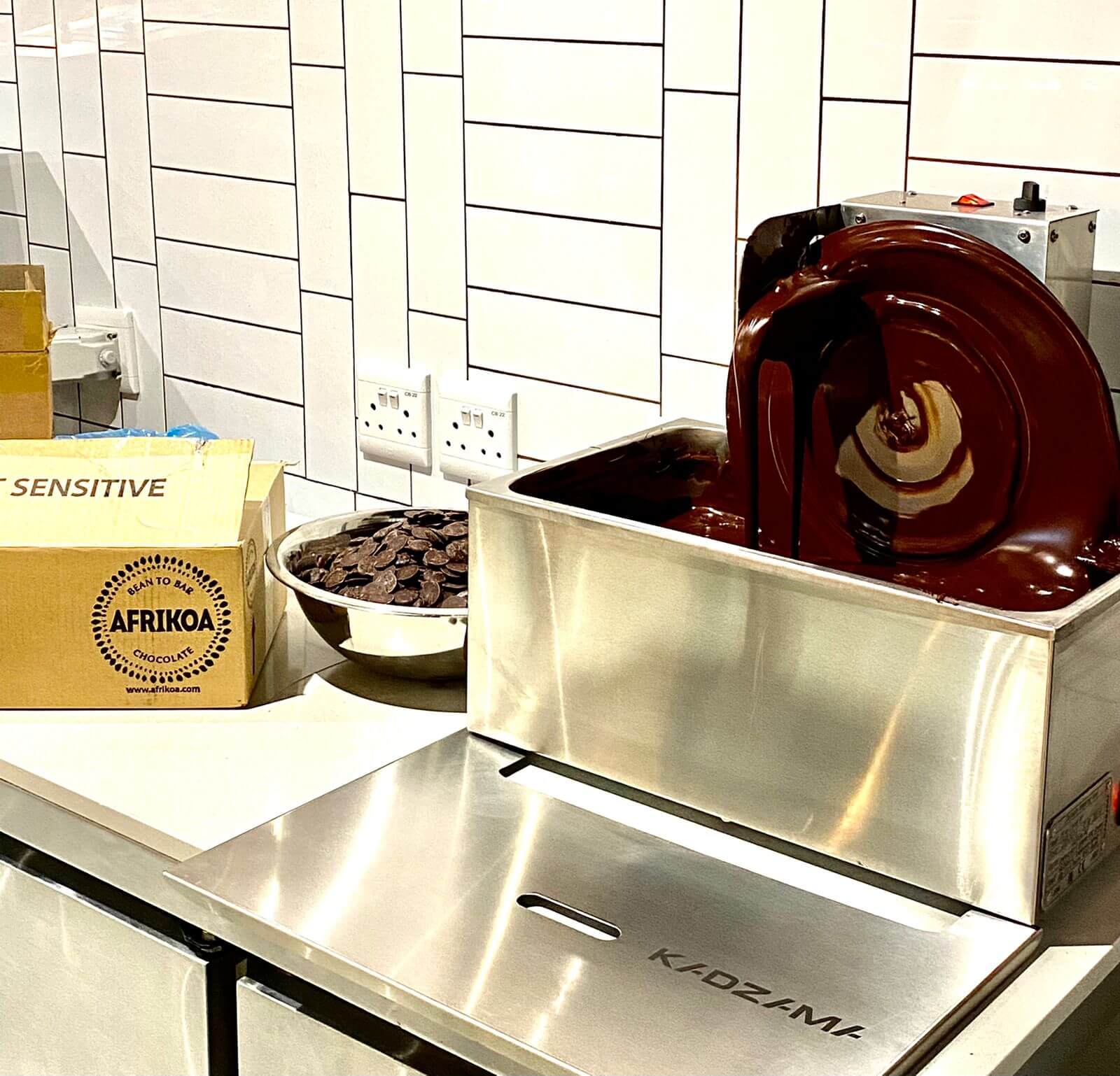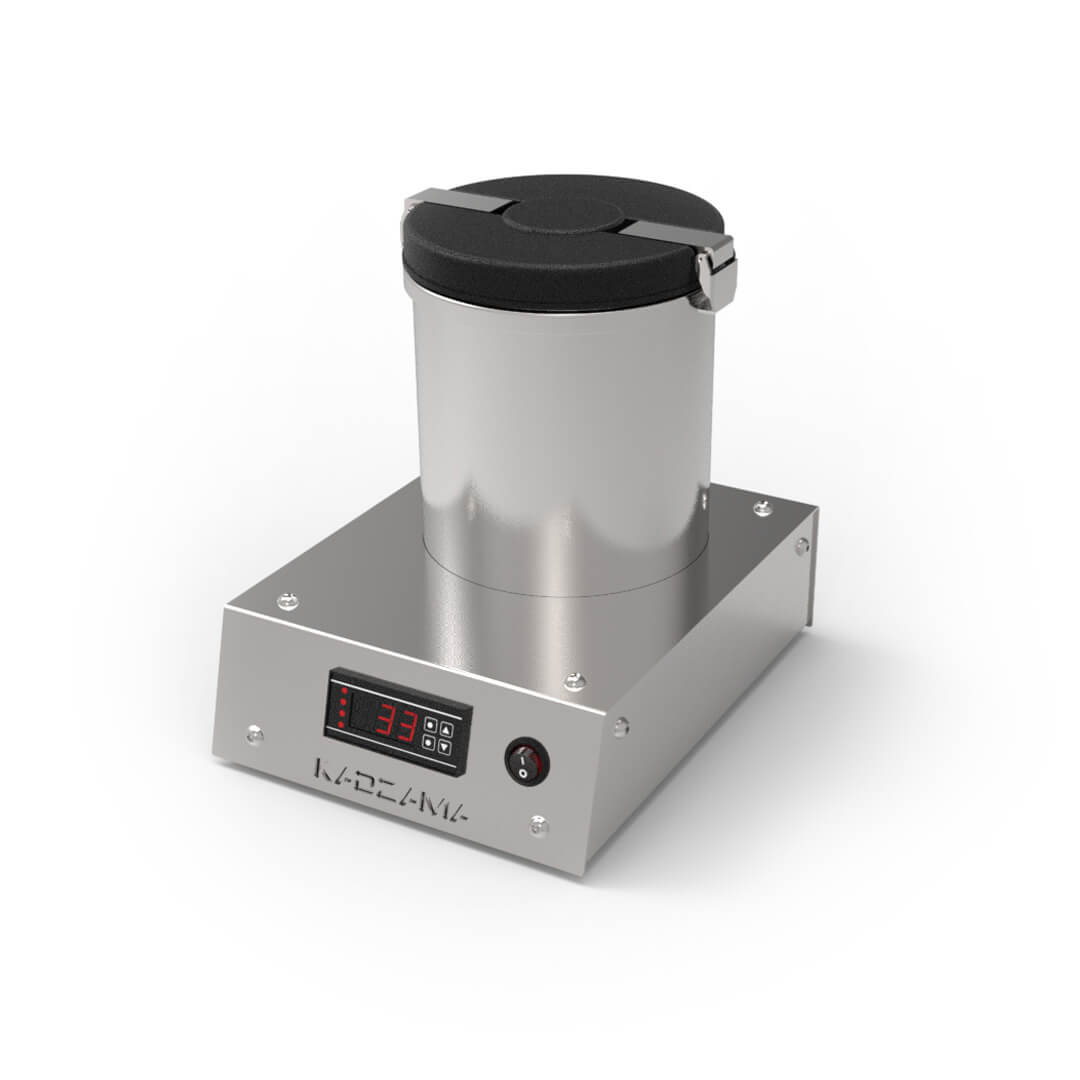 La cuve chauffe mais ne refroidit pas le chocolat comme une tempéreuse en continu. Pour pré-cristalliser rapidement le chocolat lors de l’utilisation de la mélangeuse à roue, nous recommandons d’ajouter de la « soie » — un concentré de cristaux stables de beurre de cacao — produit dans notre incubateur KADZAMA. Cela assure un tempérage instantané, des résultats constants et une brillance parfaite.