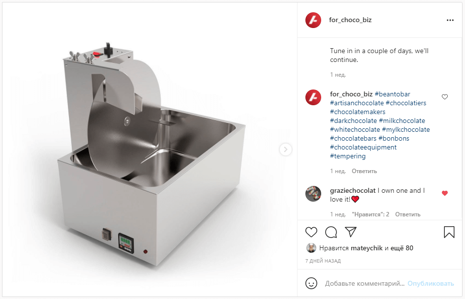 Оборудование отличного качества, простое в обслуживании и работе. Я приобрела две ванны с колесным миксером и инкубатор для кристаллов какао-масла.