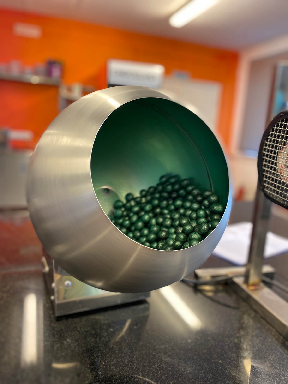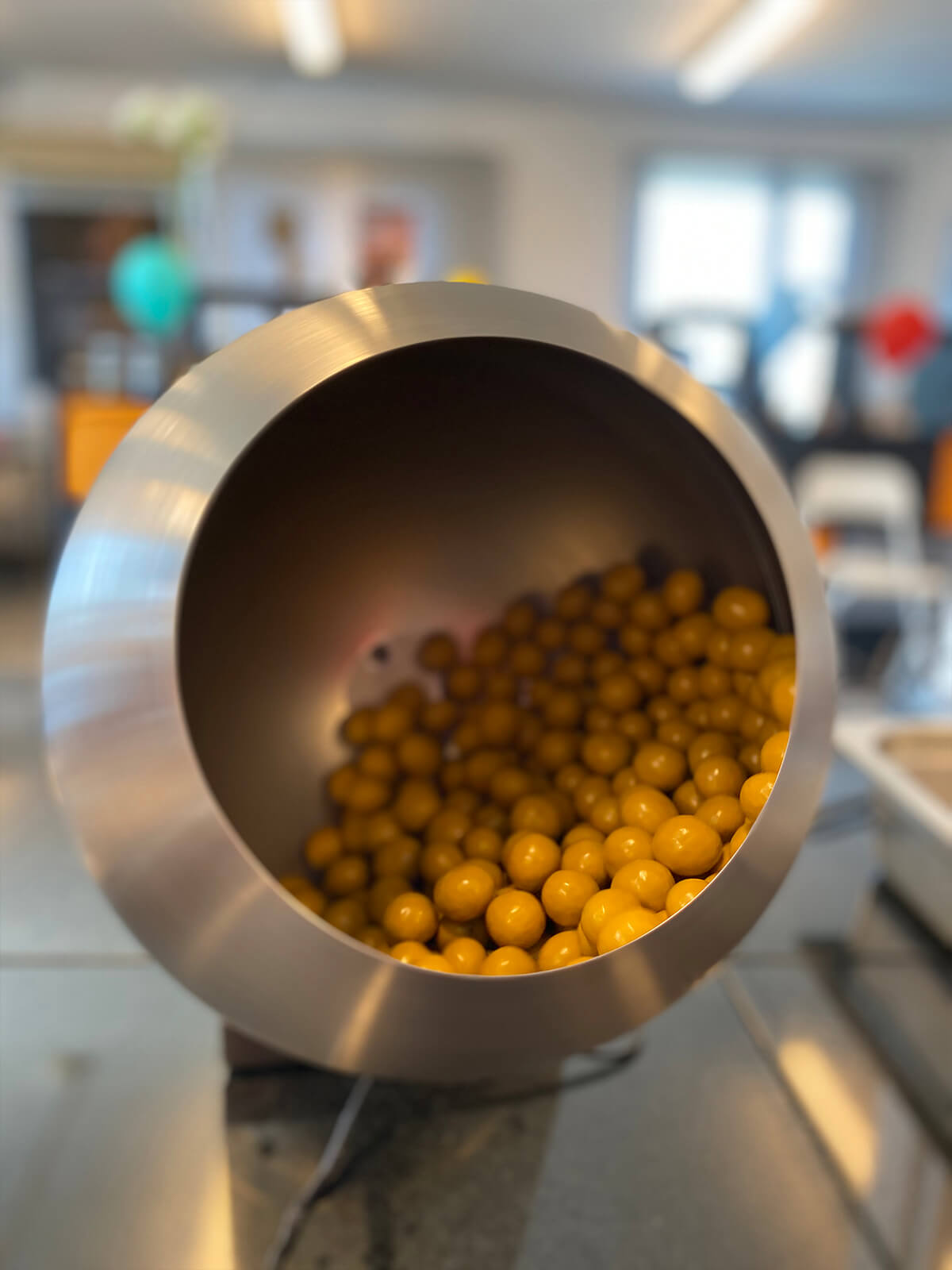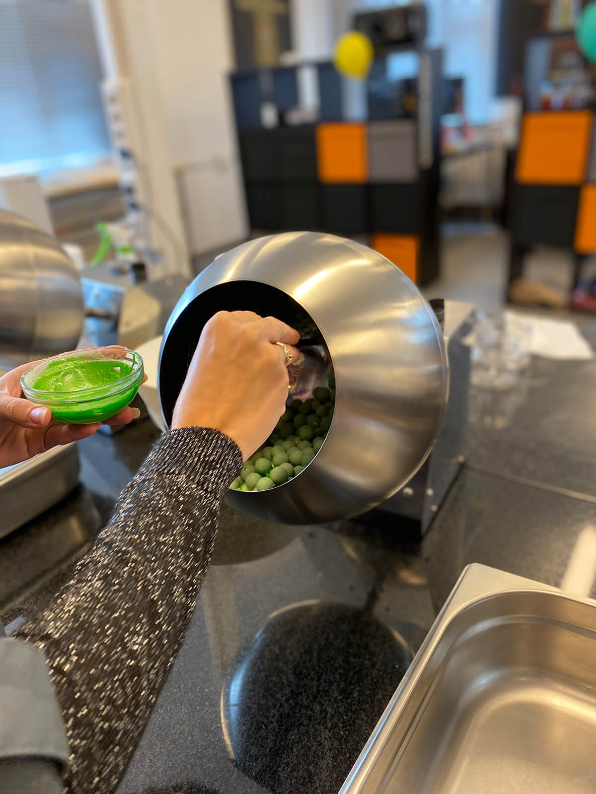 Malgré son aspect compact, la turbine d'enrobage d'une capacité de 2 kg de chargement fait un excellent travail et vous permet de créer n'importe quelle dragée en petites quantités, ce qui est pratique si vous ne faites que commencer votre projet dans la confiserie ou si les dragées ne sont pas les principaux produits de vos gammes de produits. De plus, en raison de sa petite taille, il est parfait pour élaborer et expérimenter vos propres recettes, que vous pourrez même réaliser à votre domicile.