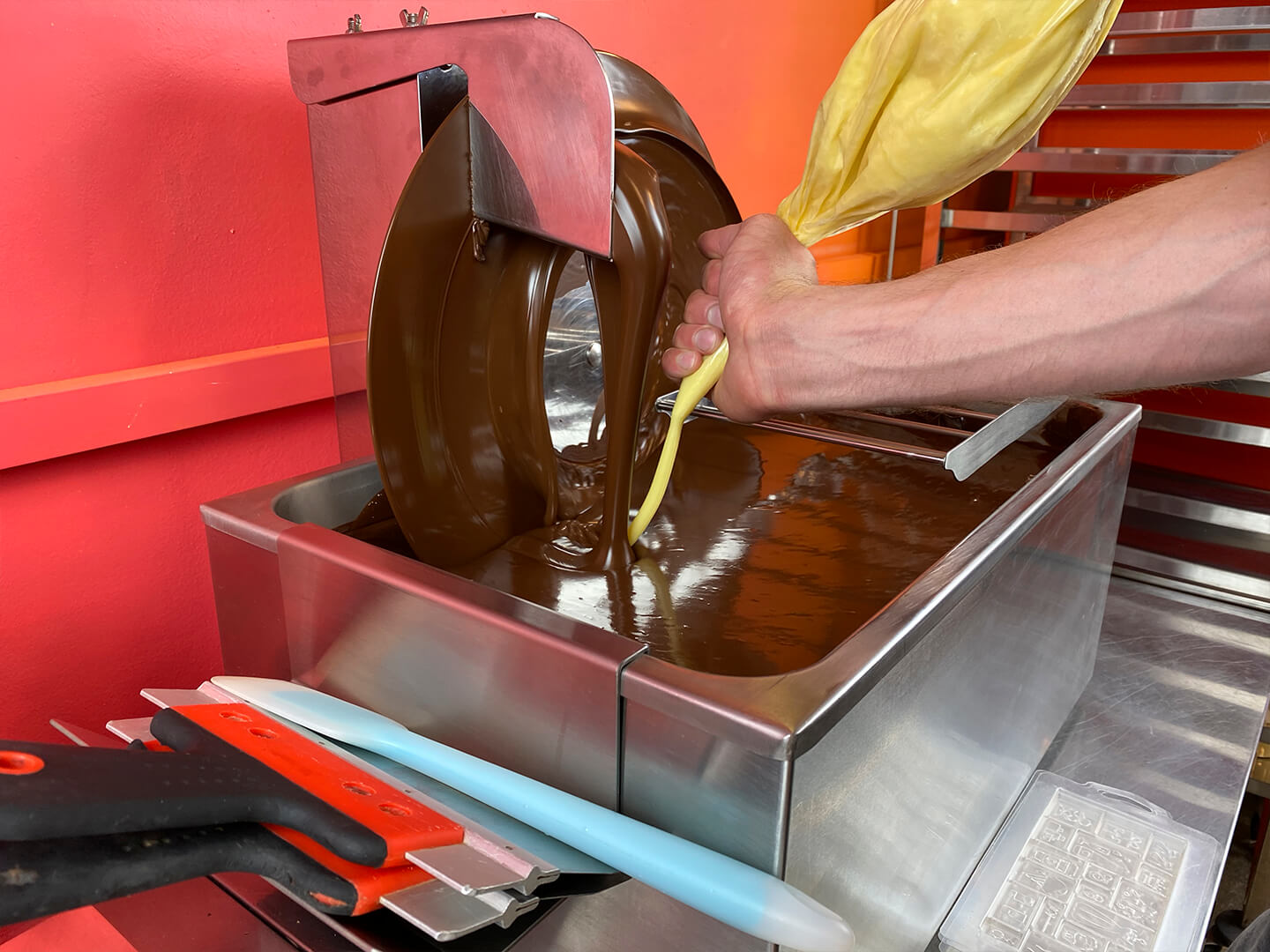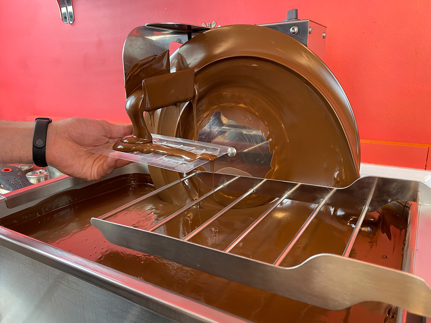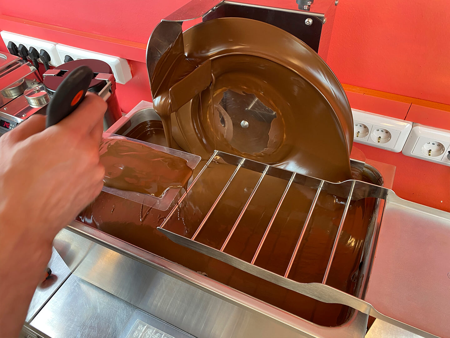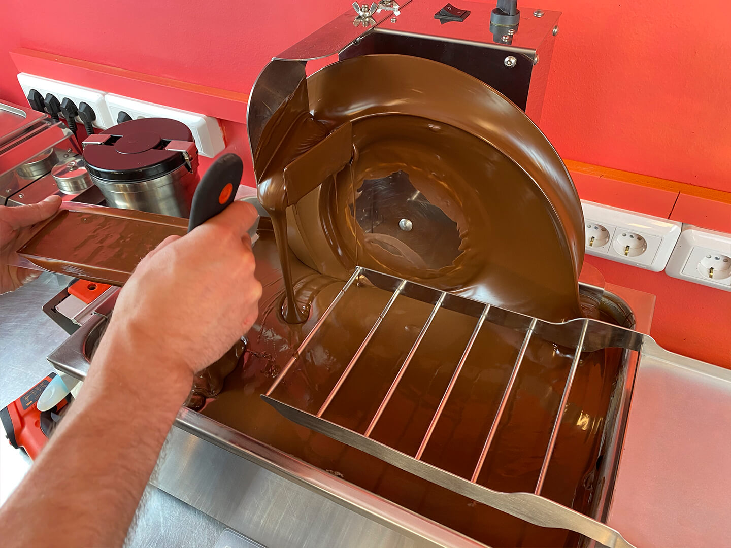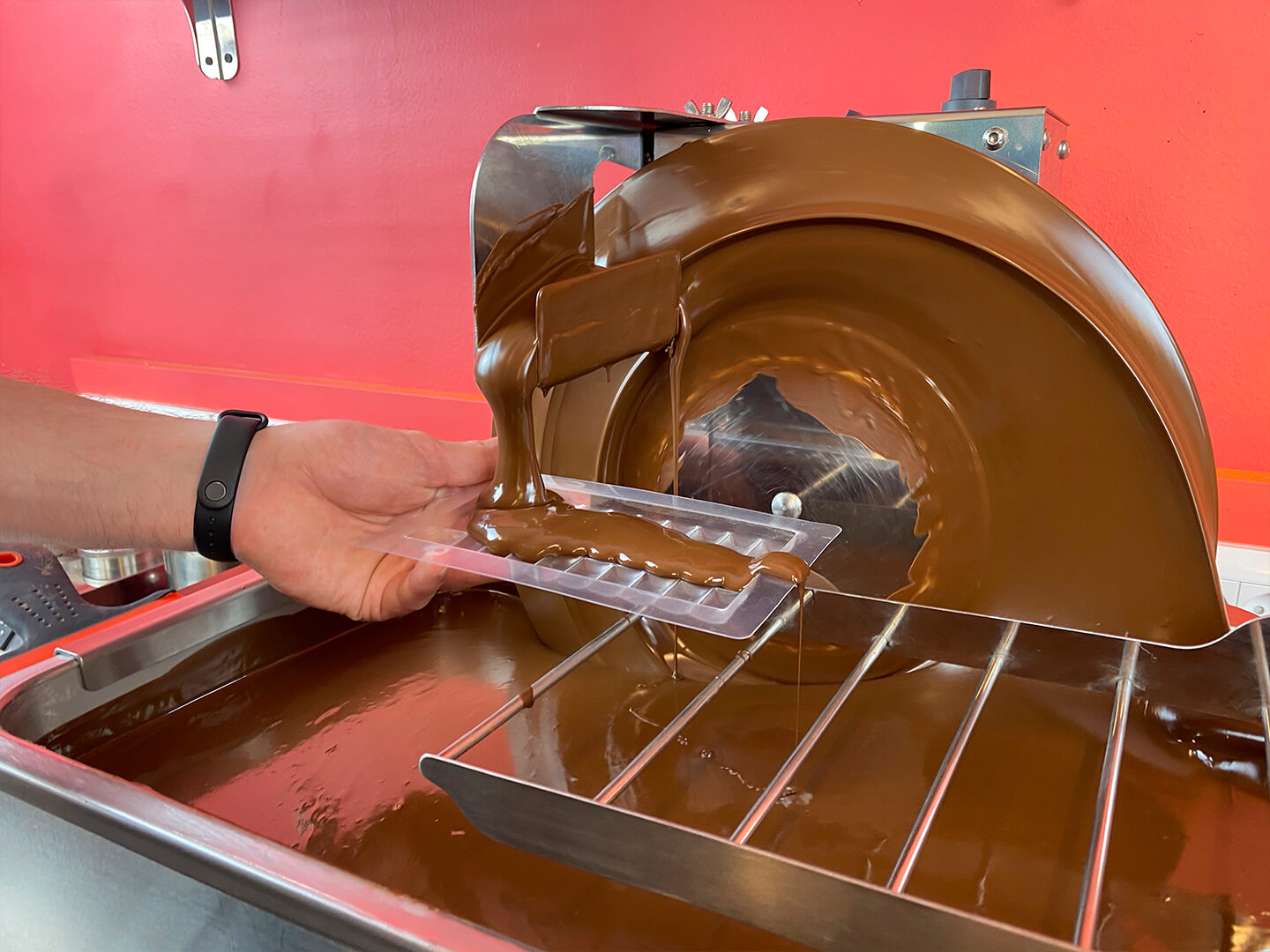 Ajustez le bec du mélangeur à roue de sorte que le flux de chocolat hors de la roue soit confortable à travailler. Placez la table vibrante à côté du bol de tempérage et commencez à verser le chocolat dans les moules, en déplaçant les moules remplis sur la table vibrante pour expulser les bulles d'air, puis sur la table. De cette manière, environ 200 barres par heure peuvent être coulées - un excellent résultat pour la micro-production.