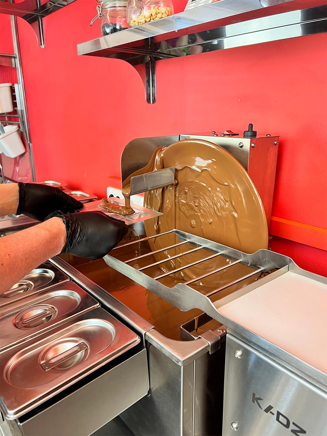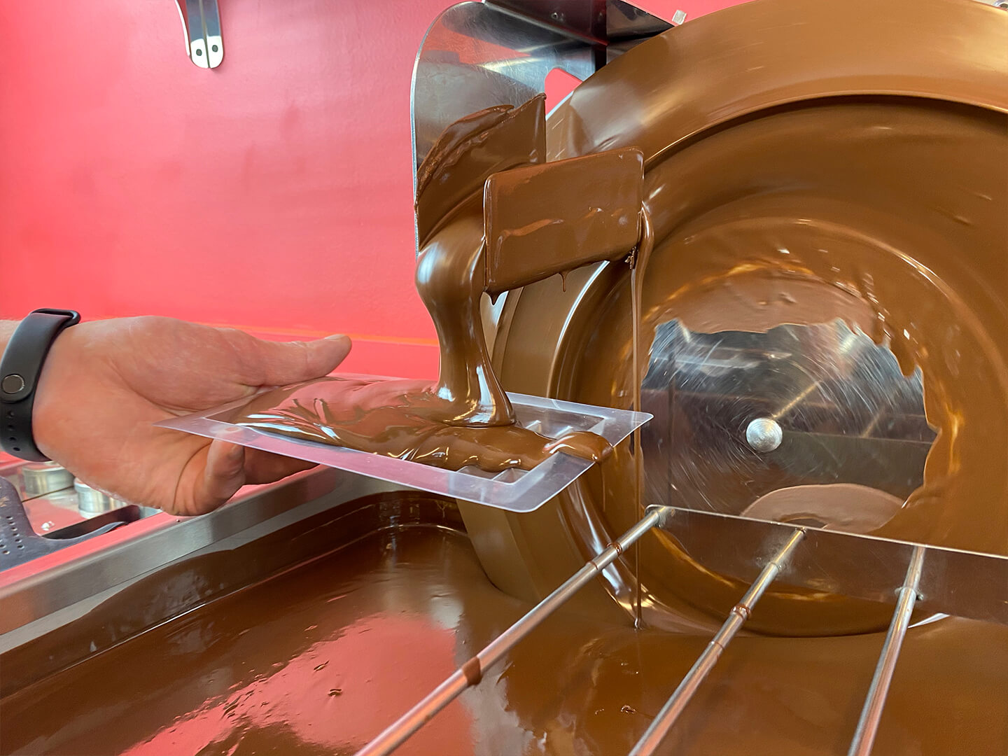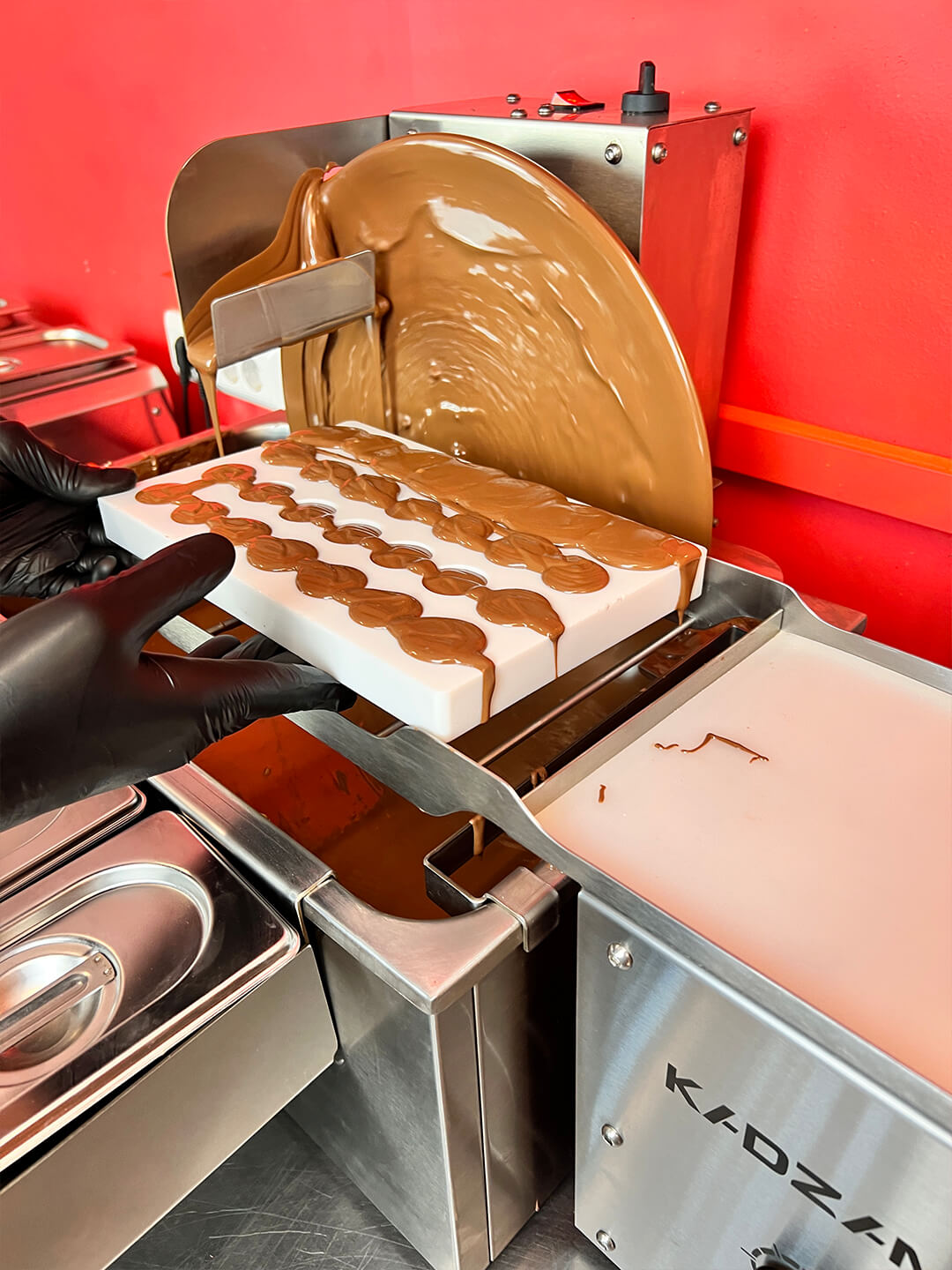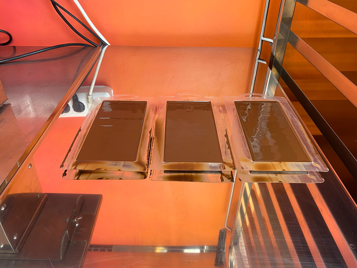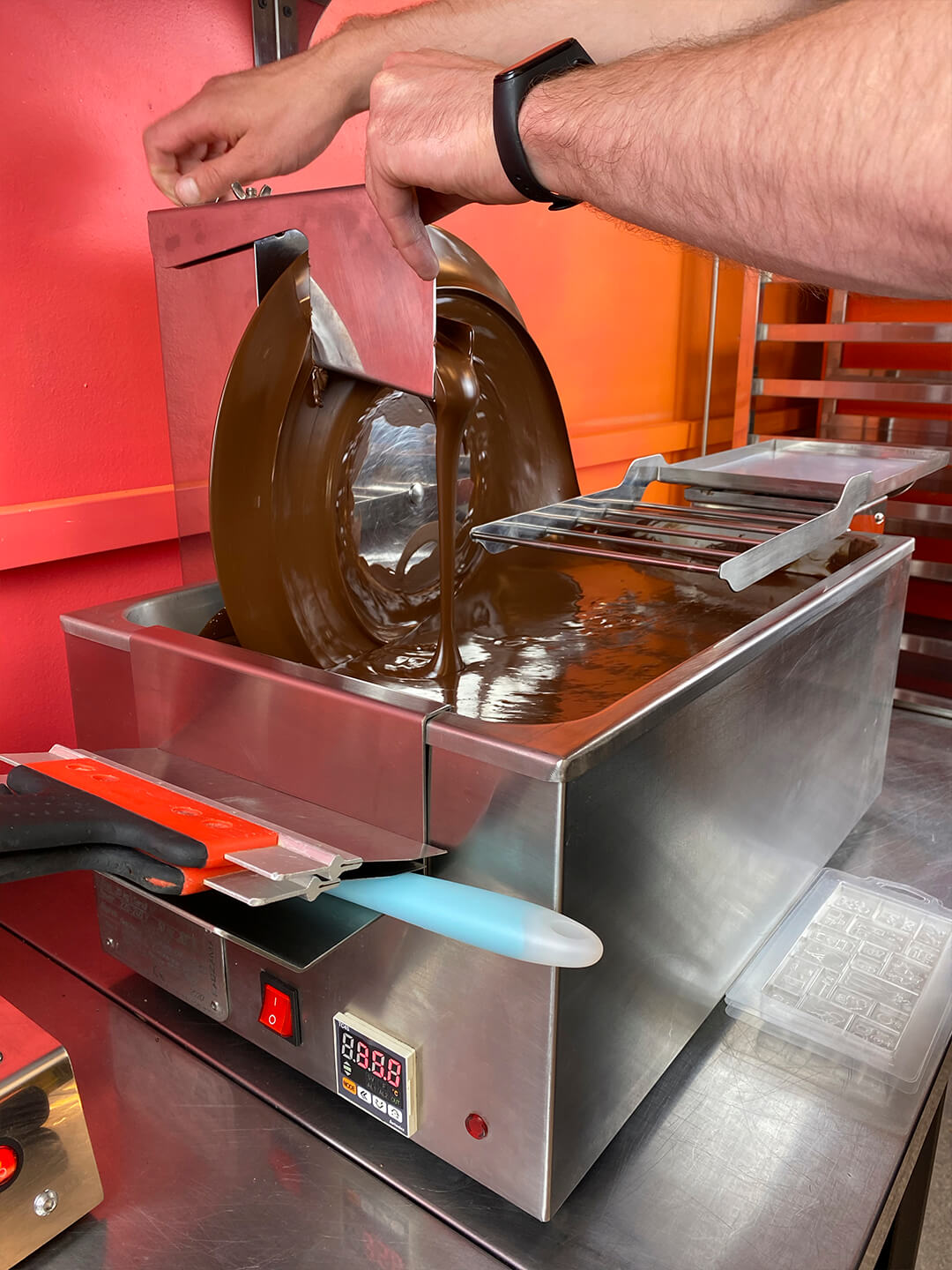 Ajustez le bec du mélangeur à roue de sorte que le flux de chocolat hors de la roue soit confortable à travailler. Placez la table vibrante à côté du bol de tempérage et commencez à verser le chocolat dans les moules, en déplaçant les moules remplis sur la table vibrante pour expulser les bulles d'air, puis sur la table. De cette manière, environ 200 barres par heure peuvent être coulées - un excellent résultat pour la micro-production.