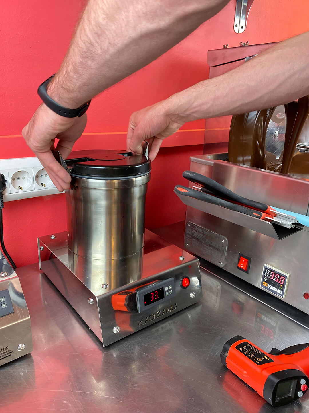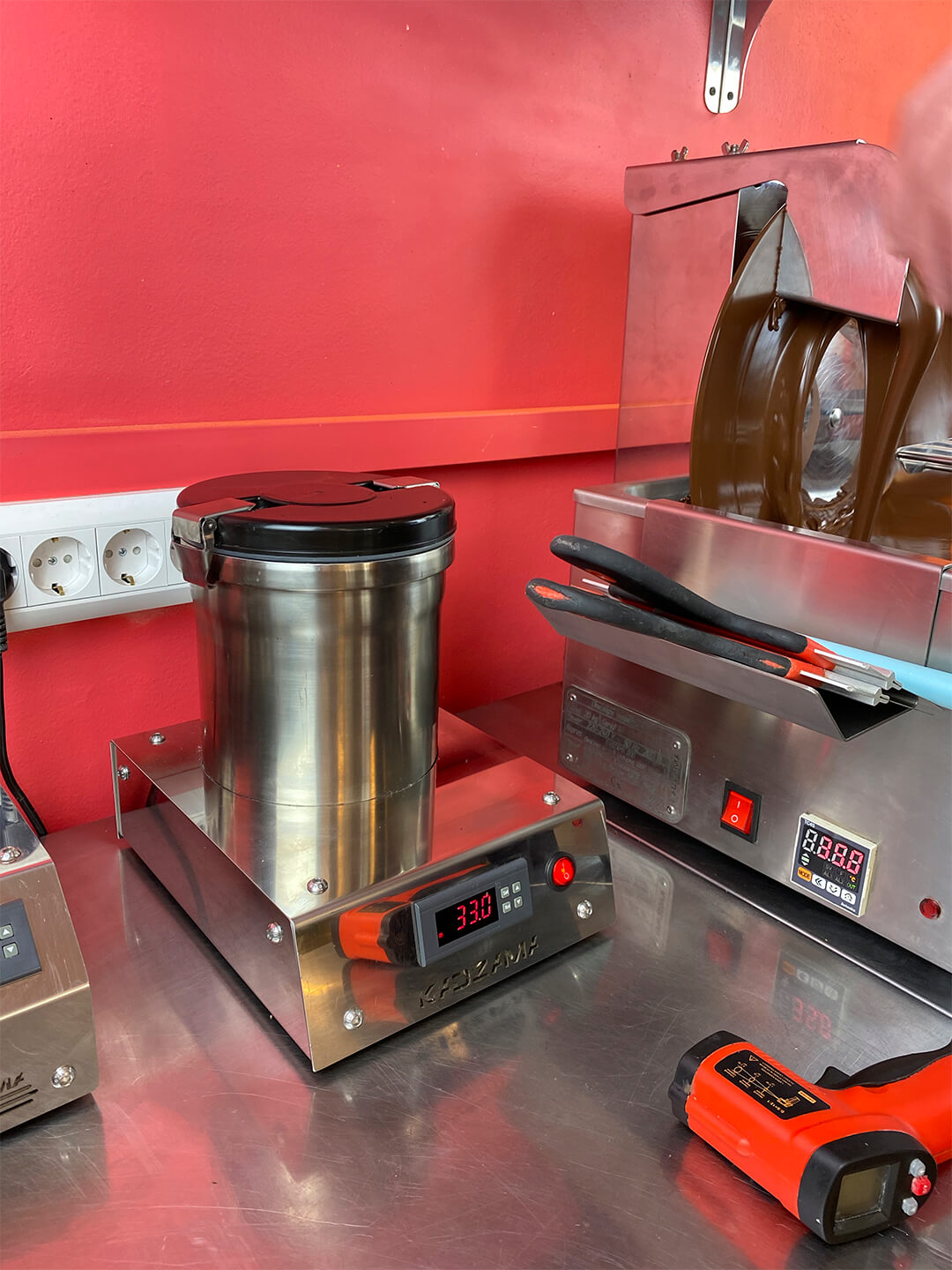 2. Ванна для темперирования - пожалуй самое оптимальное решение для работы с небольшим объёмом шоколада (до 20-30кг). Несоизмеримо проще использовать данный аппарат вместо автоматических темперирующих машин (дешевле и проще в обслуживании) с объемом до 20 кг.