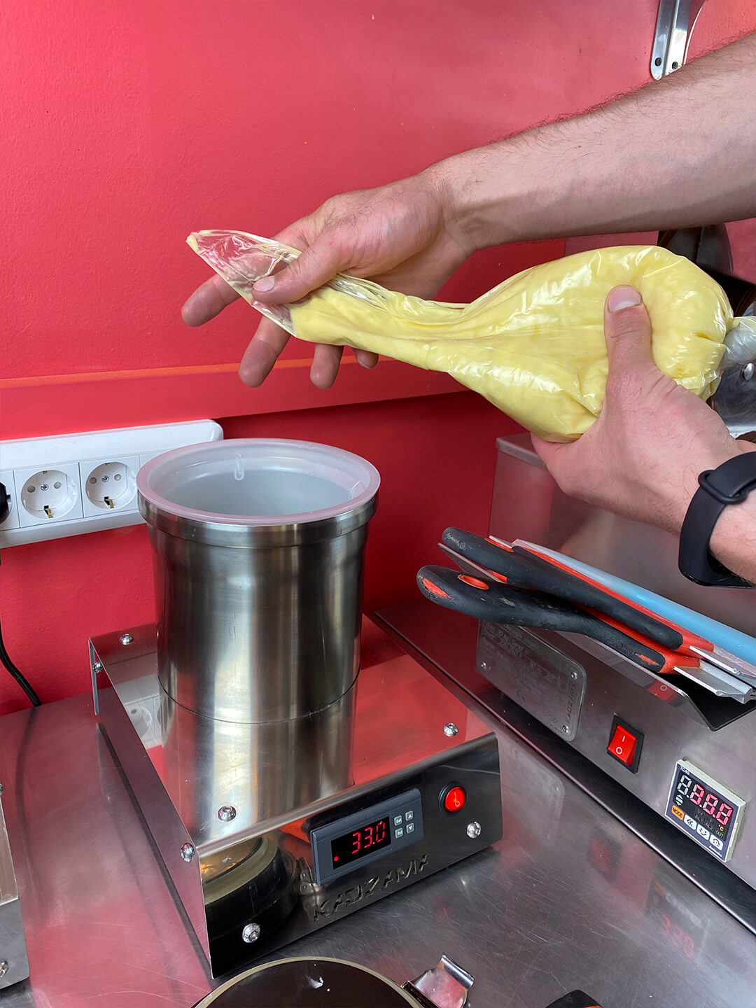 Mini incubator for cocoa butter crystals is my favourite «toy» for the last 1.5 years. An amazing machine which I use for tempering cocoa butter and chocolate. After 12 hours inside mini incubator cocoa butter gains beautiful creamy and silky texture — ideal for tempering.