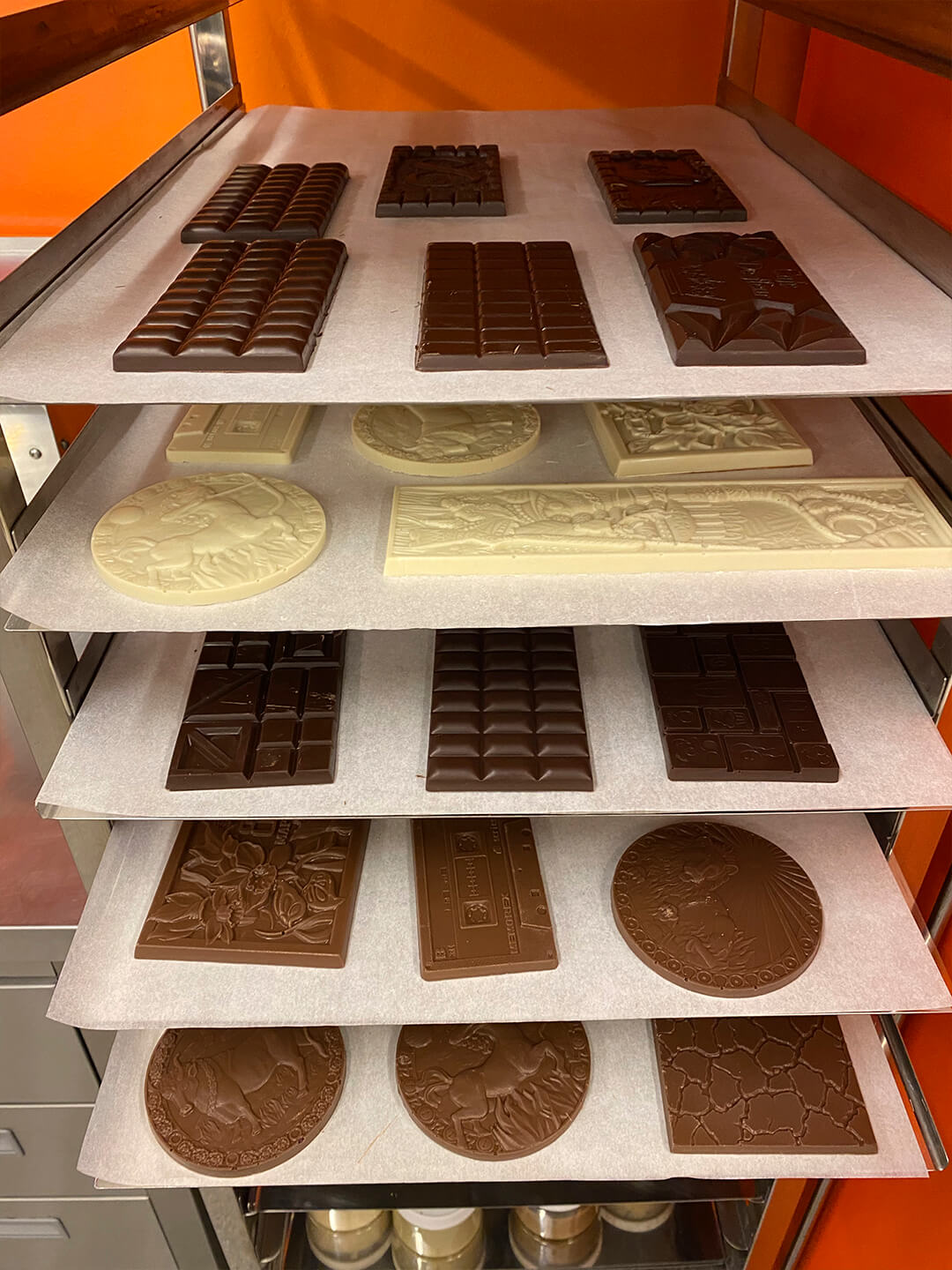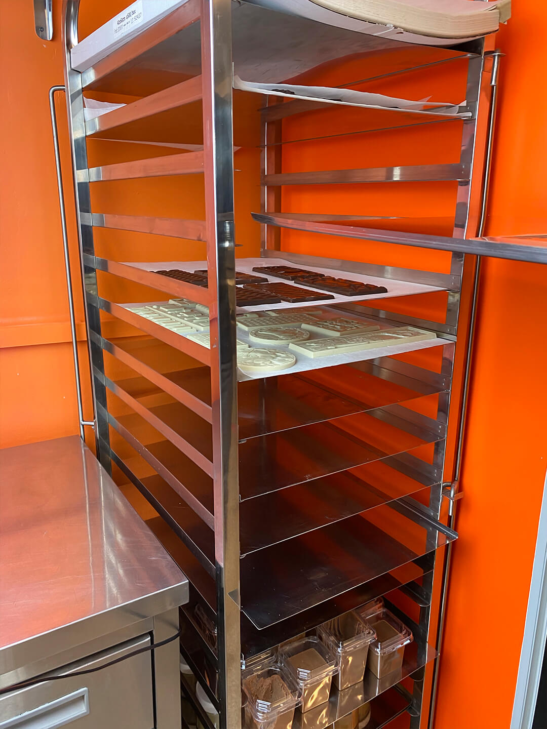 Pour la production de chocolat haché, nous vous recommandons d'utiliser des cadres de farce pour former les plaques de chocolat, qui sont ensuite divisées en morceaux. Nous vous recommandons de conserver le chocolat après cristallisation à une température de 18-20 ° C sur des plateaux insérés dans un chariot porte-plateaux. Le chariot porte-plateaux est ouvert, ce qui permet à l'air de circuler librement et vous donne un accès rapide au produit.