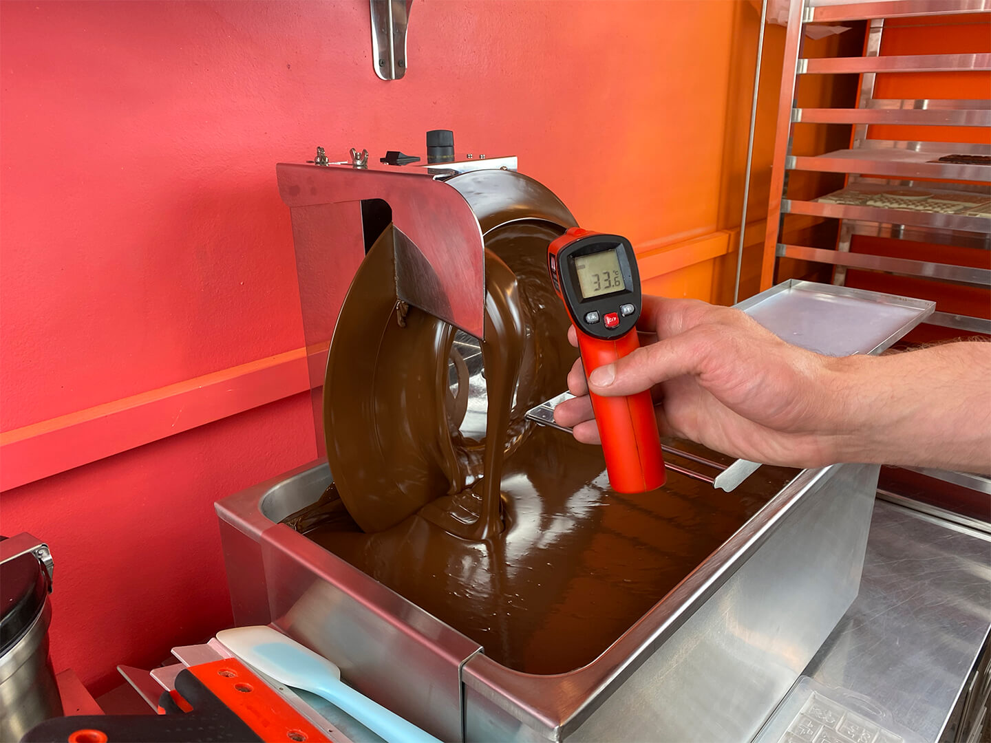 Le chocolat prêt à l'emploi est vendu sous différentes formes: culette, "boutons", disques ou mini-briques. Avant de travailler avec, il doit être fondu. Le bol de tempéreage du chocolat fera fondre le chocolat tout seul et le conservera liquide à une température constante que vous réglez aussi longtemps que vous en avez besoin. Cela vous permettra d'avoir accès à un chocolat liquide à tout moment.