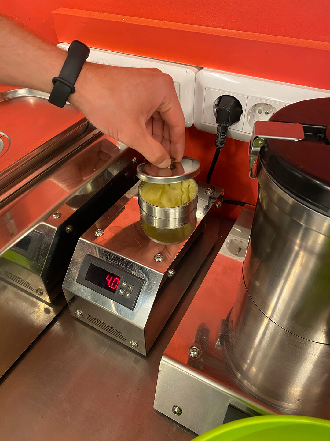 Mini incubator for cocoa butter crystals is my favourite «toy» for the last 1.5 years. An amazing machine which I use for tempering cocoa butter and chocolate. After 12 hours inside mini incubator cocoa butter gains beautiful creamy and silky texture — ideal for tempering.