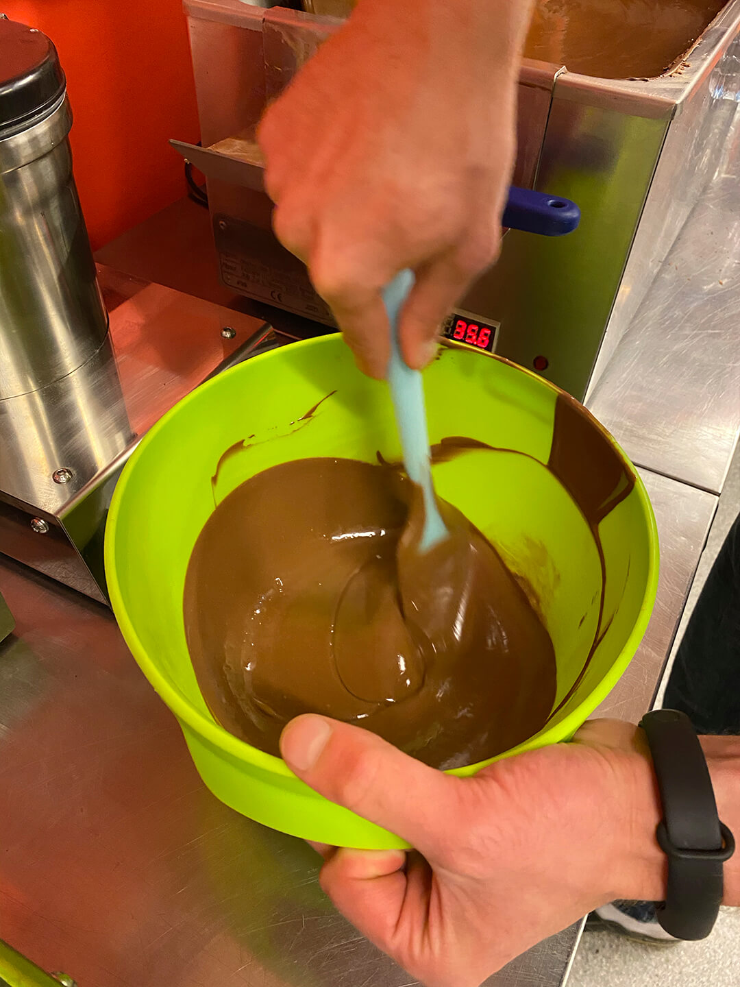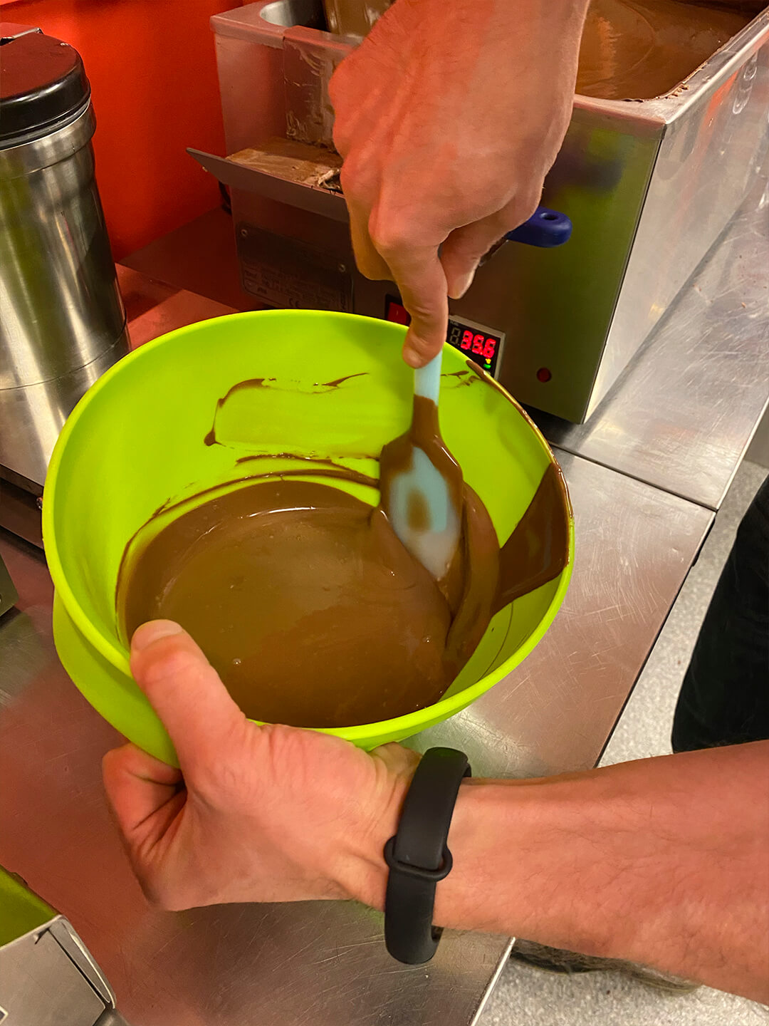 2. Ванна для темперирования - пожалуй самое оптимальное решение для работы с небольшим объёмом шоколада (до 20-30кг). Несоизмеримо проще использовать данный аппарат вместо автоматических темперирующих машин (дешевле и проще в обслуживании) с объемом до 20 кг.